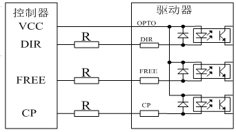 若VCC大于+5V,則使用到的CP、DIR、FREE端子分別外串接限流電阻R,保證給內(nèi)部光耦提供8~15mA的驅(qū)動電流,參見表一